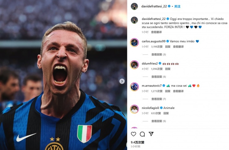 弗拉泰西也在賽后通過社媒曬出自己的怒吼慶祝照,并配文:“今天(的勝利)太重要了……如果我有時踢得不太好,我對此非常抱歉。但那些了解我的人都清楚發生了什么。加油,國際米蘭!”