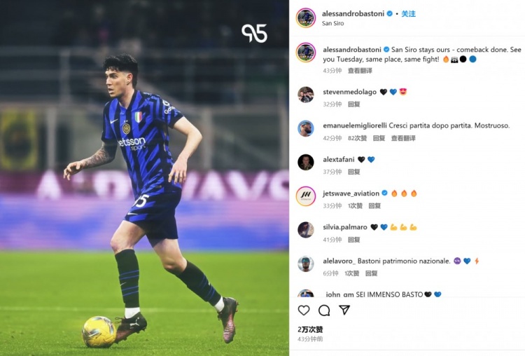 數據統計顯示,巴斯托尼本場貢獻4關鍵傳球+2射門,此外6次對抗有5次成功。他也在賽后通過社媒曬出自己的比賽照,并配文:“圣西羅仍然是我們的,逆轉成功。同一塊場地,同等的努力奮戰,球迷們周二再見!”