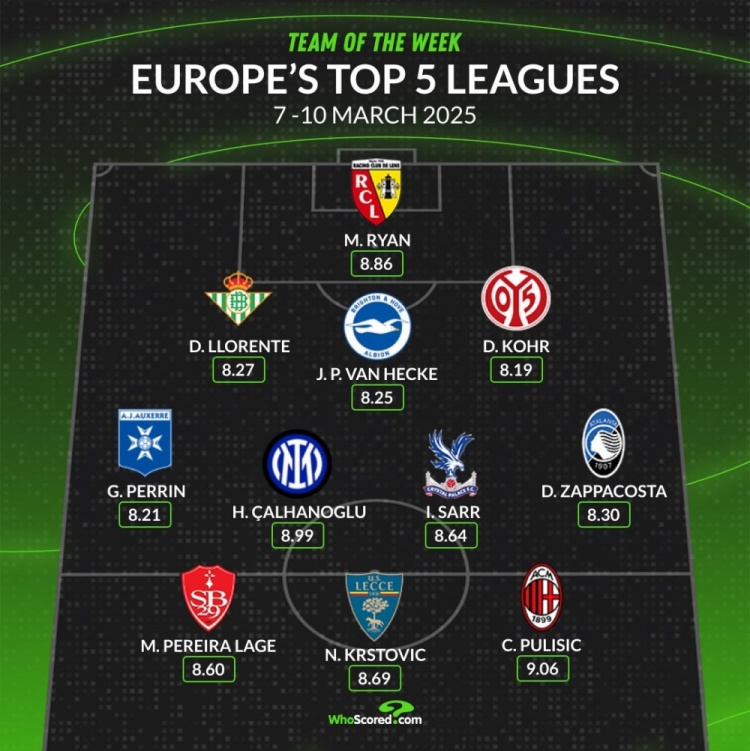whoscored本周五大聯(lián)賽最佳陣: