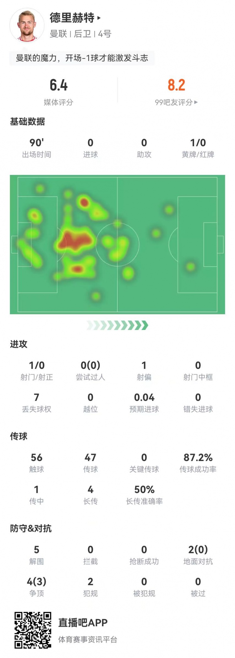 3月14日訊 曼聯在本場歐聯杯4-1大勝皇家社會,德里赫特本場數據如下: