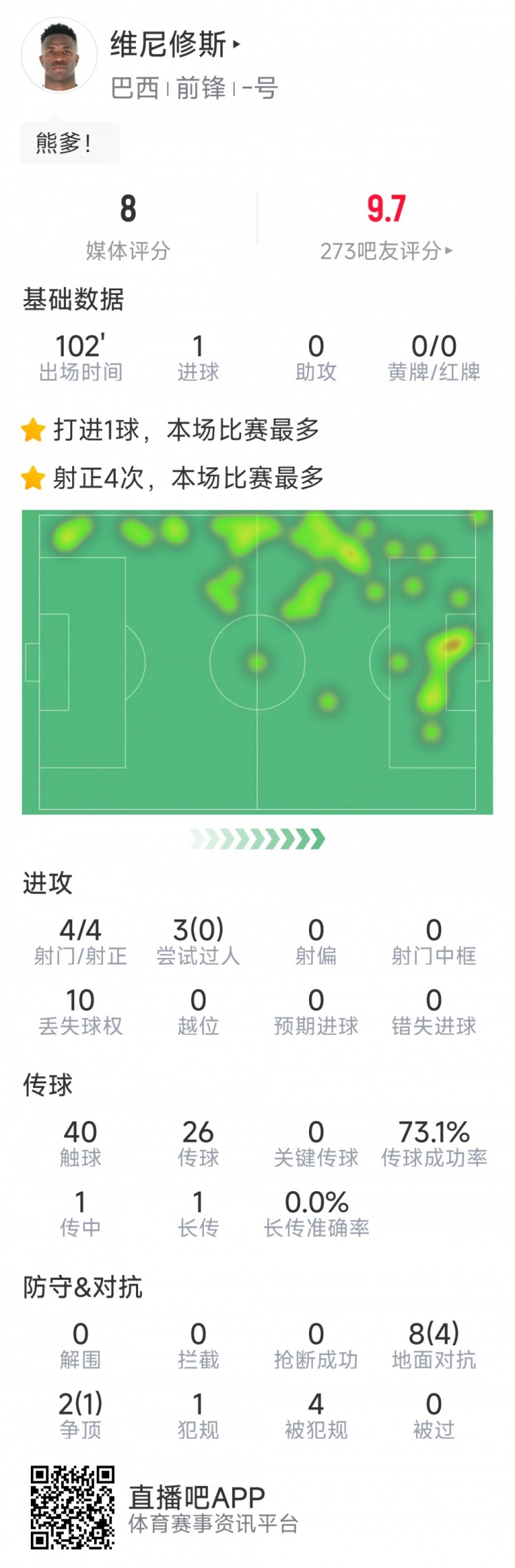 維尼修斯本場數據:打進絕殺,4次射門均射正,5次成功對抗